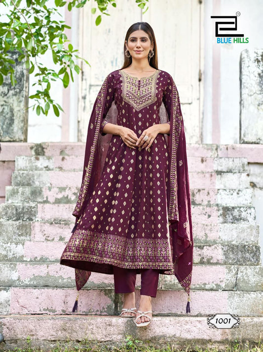 KURTIS- UMBERLLA BLUE HILLS WITH Chanderi foil print -3PCS SET